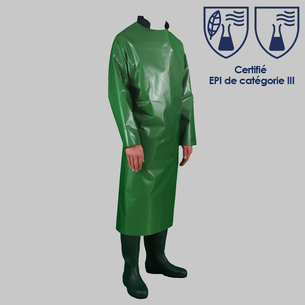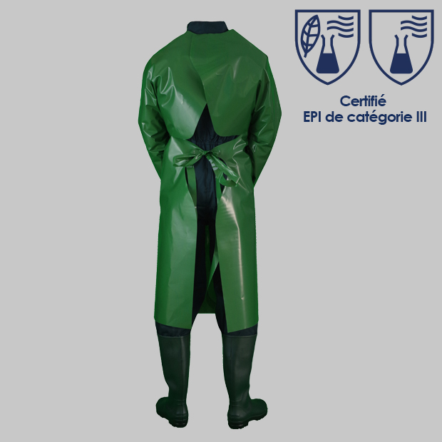 Ce tablier couvre l’avant du corps, le haut du dos et les bras.Il s’enfile facilement sur un vêtement de travail, sans avoir à retirer les bottes.