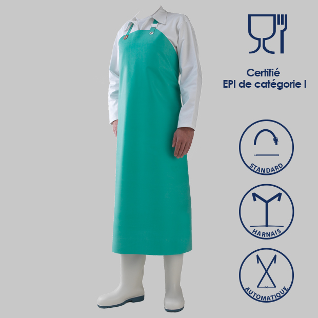 Le tablier BRAVO est adapté à l’utilisation dans les industries agroalimentaires (haute résistance aux graisses animales, au sang et à la température).