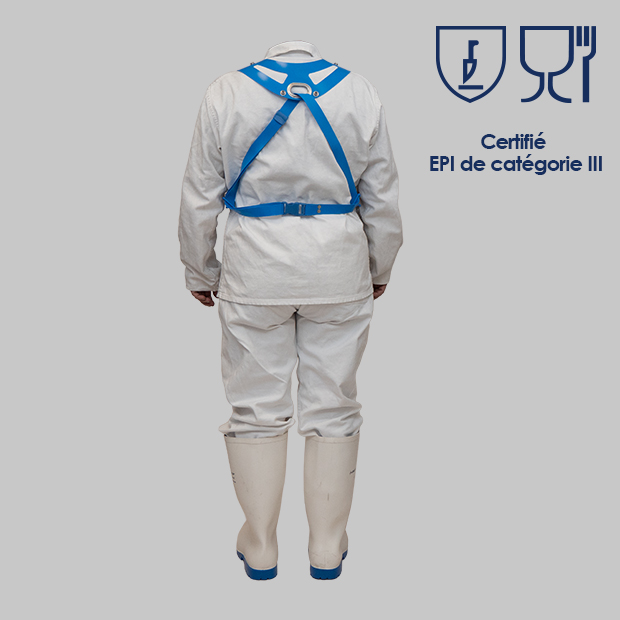 La partie haute du tablier est équipée de 4 points de fixation, double platine, qui permettent à l’opérateur d’ajuster l’équipement selon sa morphologie.