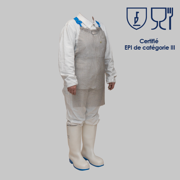 Le Tablier de protection en cotte de mailles LIGHTINOX est un équipement de protection individuelle (EPI) de catégorie III.